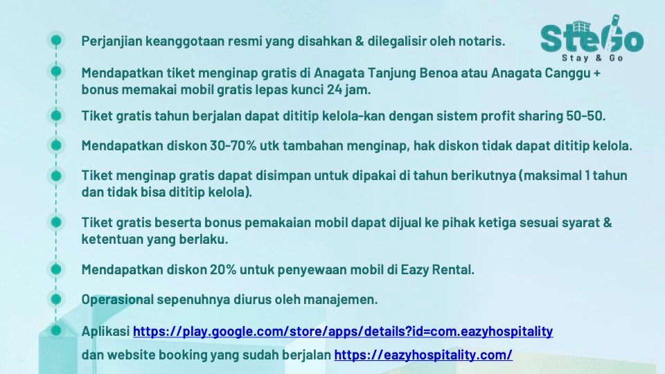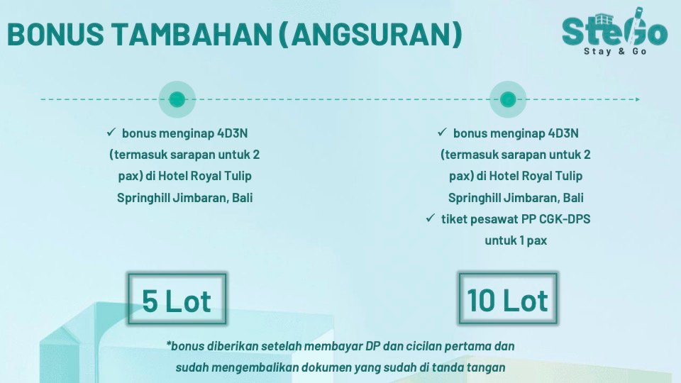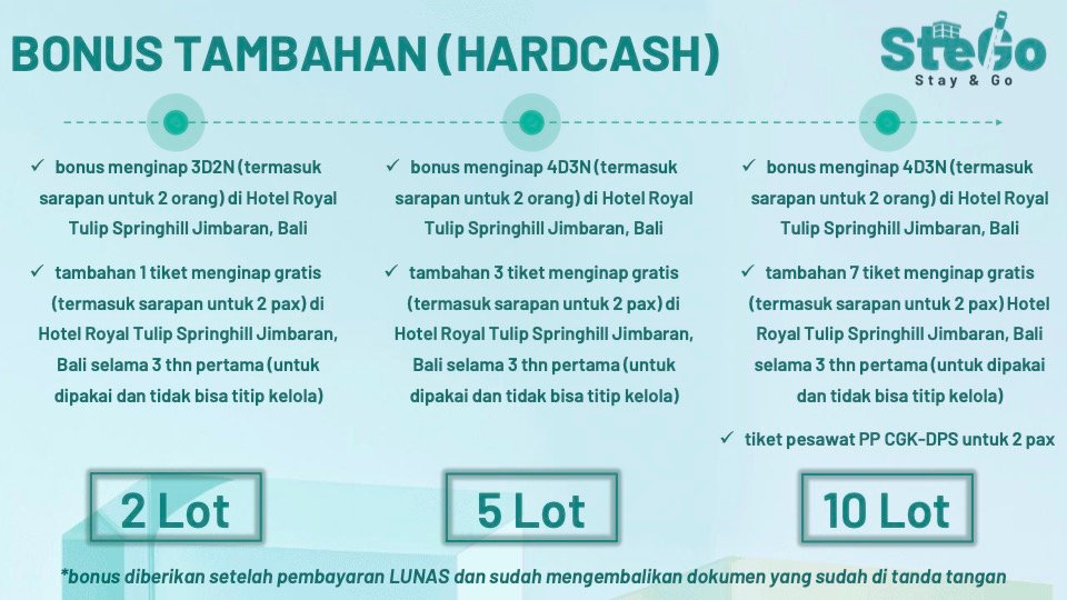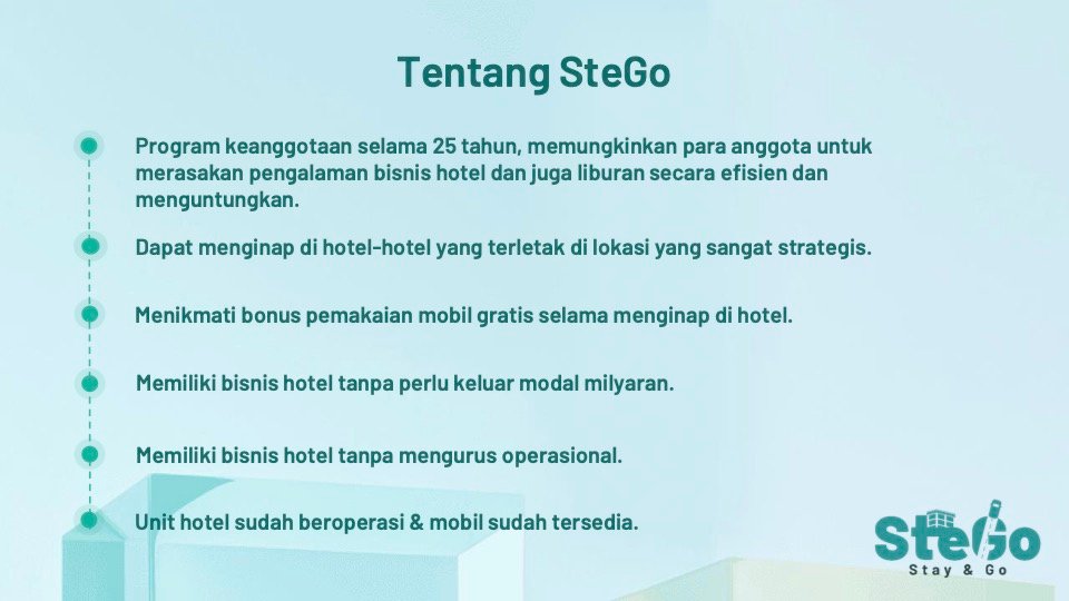 SteGo - Stay & Go adalah produk inovatif dari PT Indonesia Jaman Sekarang, yang dirancang untuk memberikan akses kepada anggota untuk memiliki bisnis perhotelan tanpa harus membayar modal besar atau repot mengurus operasional dan memiliki akses liburan menyenangkan yang akan memberikan kenangan tak terlupakan.